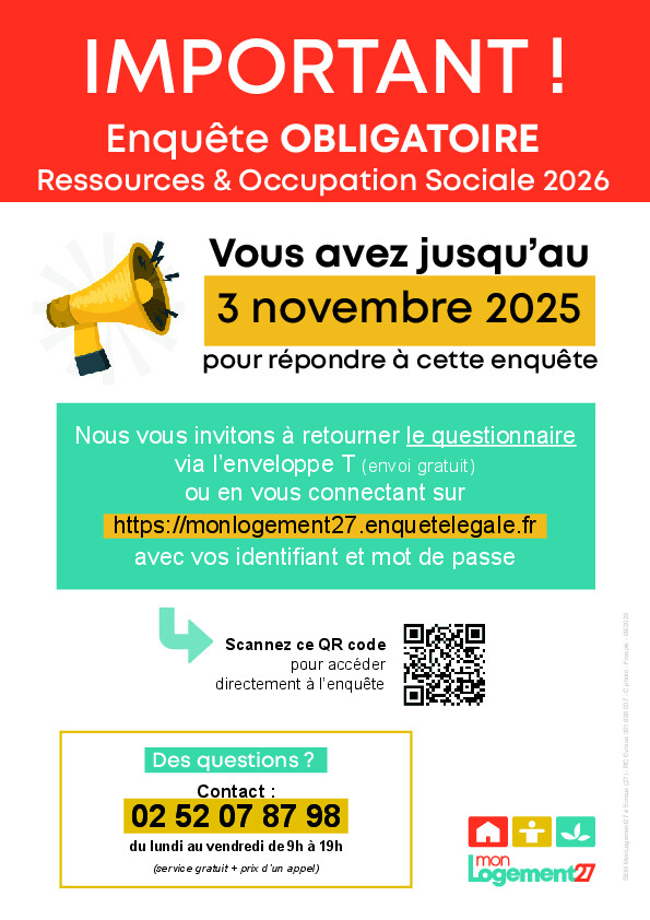 ML27 souhaite sensibiliser ses locataires sur l'importance de retourner cette enquête avec leur avis d'imposition 2025 sur les revenus 2024 pour d'éviter l'application de pénalité et de surloyer qui peuvent atteindre des montants à plus de 450 €