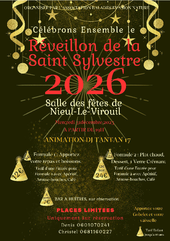 L'association Balades Evasion Nature vous propose de célébrer ensemble le réveillon de la Saint Sylvestre 2026 le Mercredi 31 Décembre 2025 à 19h à la salle des fêtes de Nieul le Virouil.