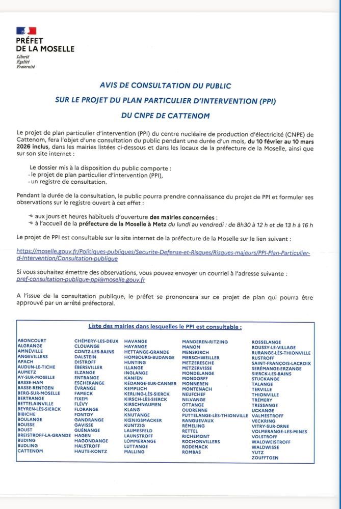 Le projet de plan particulier d'intervention (PPI) du centre nucléaire de production d'électricité (CNPE) de Cattenom fera l'objet d'une consultation du public pendant une durée d'un mois, du 10 février au 10 mars 2026 inclus.