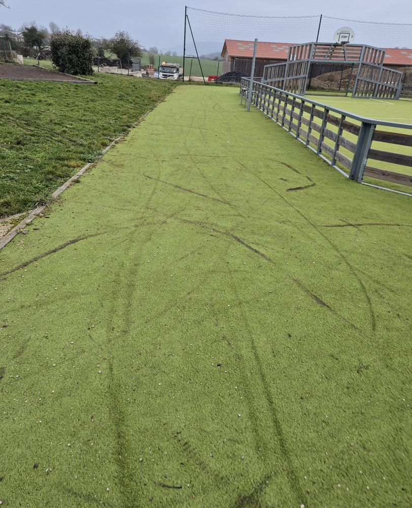 Ce week-end, deux adolescents identifiés ont effectué des dérapages en trottinette et moto électrique sur le gazon de l’aire de jeux.