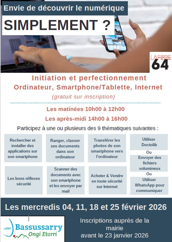 La mairie de Bassussarry, en partenariat avec La Fibre64, vous propose une série d'ateliers thématiques gratuits en février !