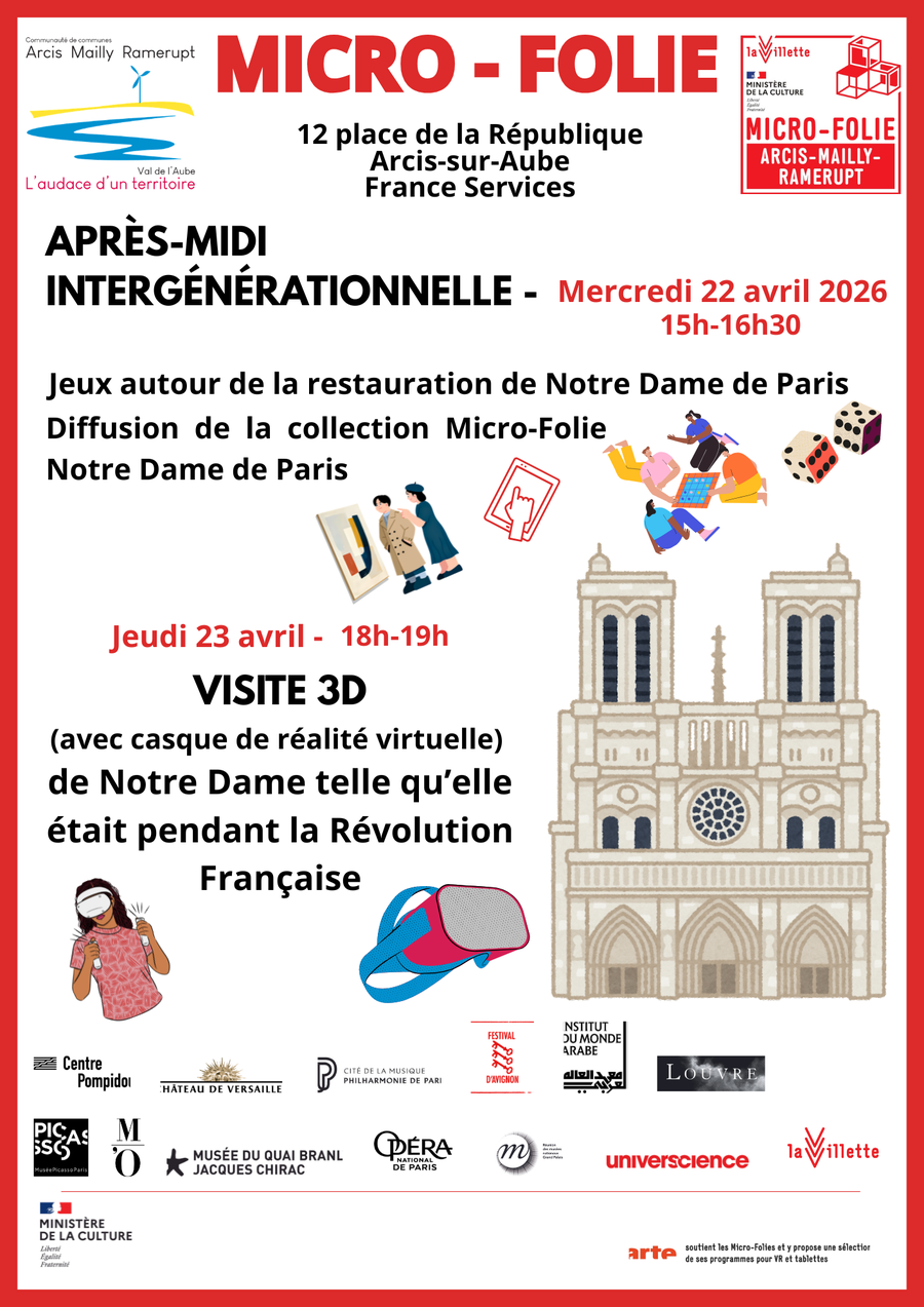 Il s’agit d’une après-midi jeux intergénérationnelle sur le thème de la restauration de Notre Dame de Paris (métiers de la restaurations, matériaux utilisées, étapes du chantier, techniques de restauration, etc.). Le jeudi soir la Micro-Folie propose une visite 3D, à l’aide de casque de réalité virtuelle, de Notre Dame à l’époque de la Révolution française. Les animations sont gratuites et tous publics.