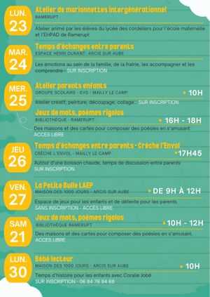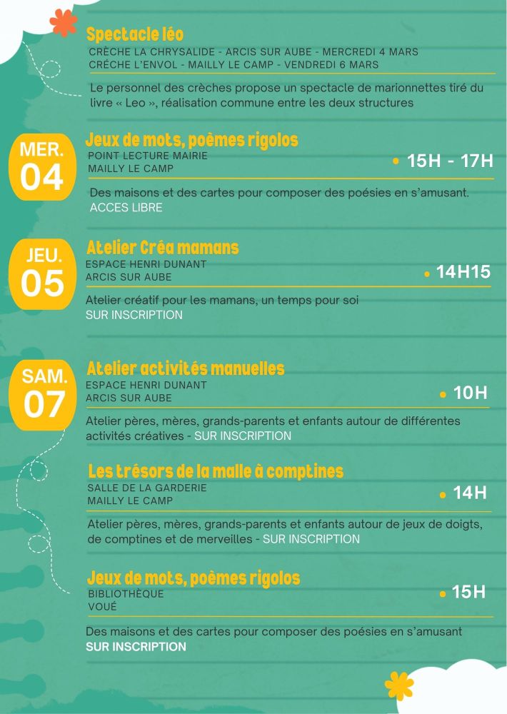 Un mois d’animations pour les familles et les professionnels avec des enfants de la naissance à 6 ans, avec le 28 mars, un après-midi multi-ateliers à la salle des fêtes de Villette-sur-Aube.
