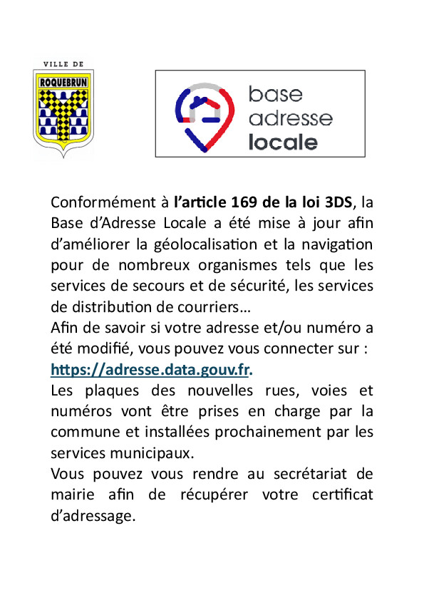 suite à la mise à jour de la base d'adressage sur la commune