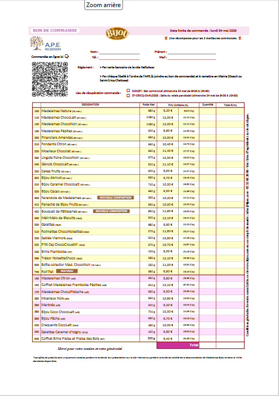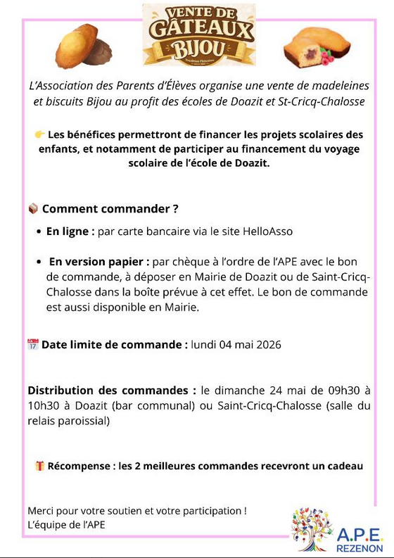 L’APE organise une vente de madeleines et biscuits Bijou pour financer les projets scolaires des enfants 🎒