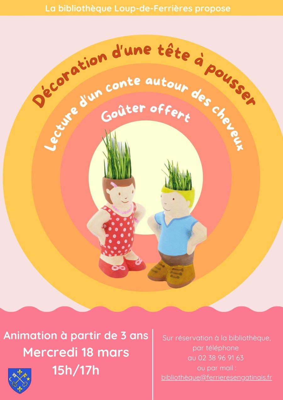 Venez participer à l'animation de la bibliothèque de Ferrières avec la lecture d'un conte autour des cheveux et l'atelier décoration d'une tête à pousser. Le goûter est offert !