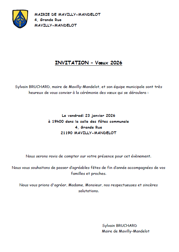 Sylvain BRUCHARD, maire de Mavilly-Mandelot, et son équipe municipale sont très heureux de vous convier à la cérémonie des voeux qui se déroulera :