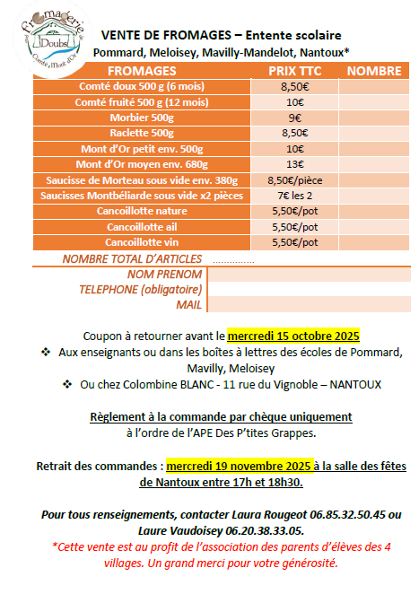 Nb : comme chaque année, les Monts d'Or et les accompagnements seront commandés auprès de l'entente scolaire du RPI Pommard/Mavilly-Mandelot/Meloisey/Nantoux afin d'aider au financement des activités des élèves.