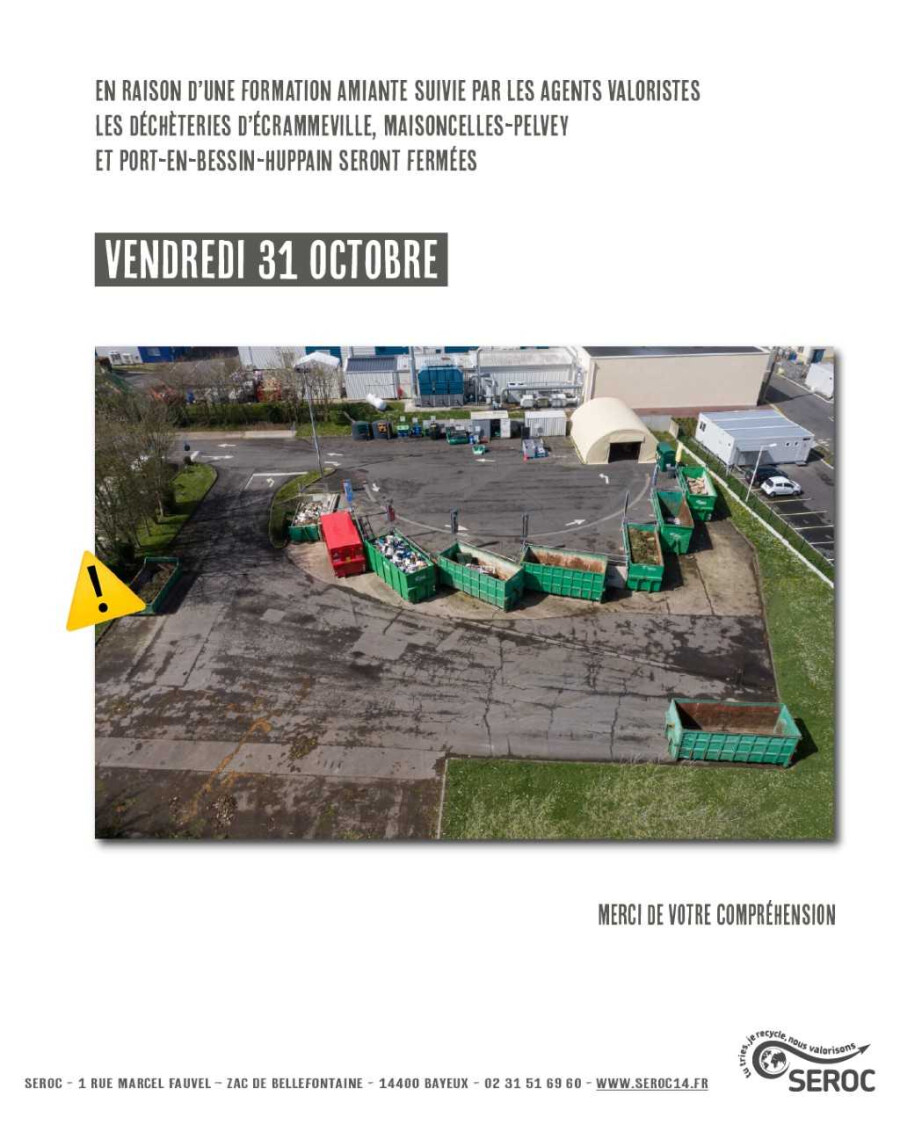 que les déchèteries d’Écrammeville, Maisoncelles-Pelvey et Port-en-Bessin-Huppain seront fermées toute la journée du vendredi 31 octobre 2025,