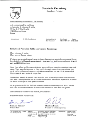 La commune de Kranzberg nous invite au 55ème anniversaire du jumelage.