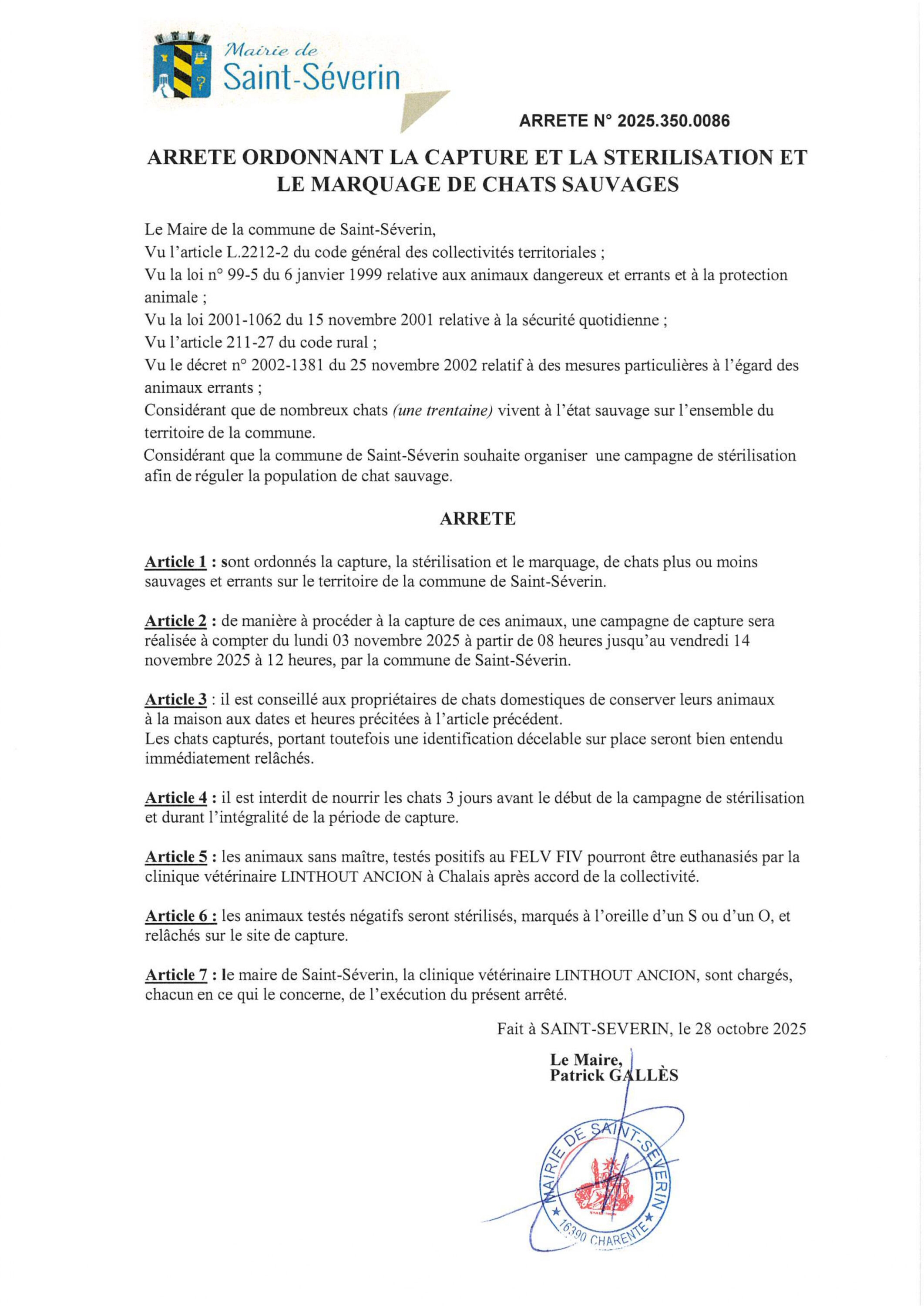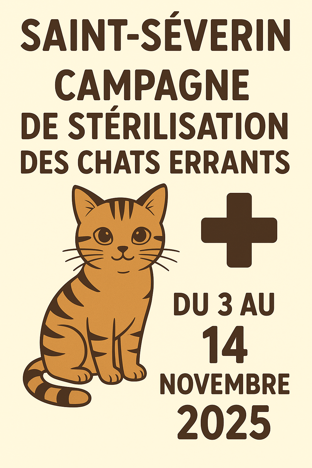 Dans le cadre de la régulation de la population féline, une campagne de stérilisation des chats sauvages sera organisée sur le territoire communal du 3 au 14 novembre 2025.