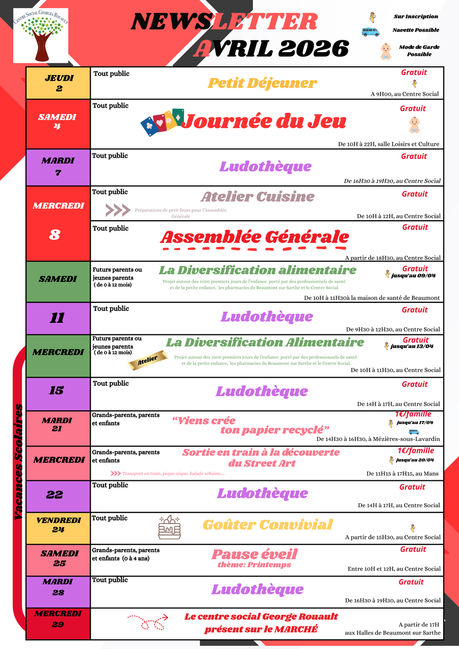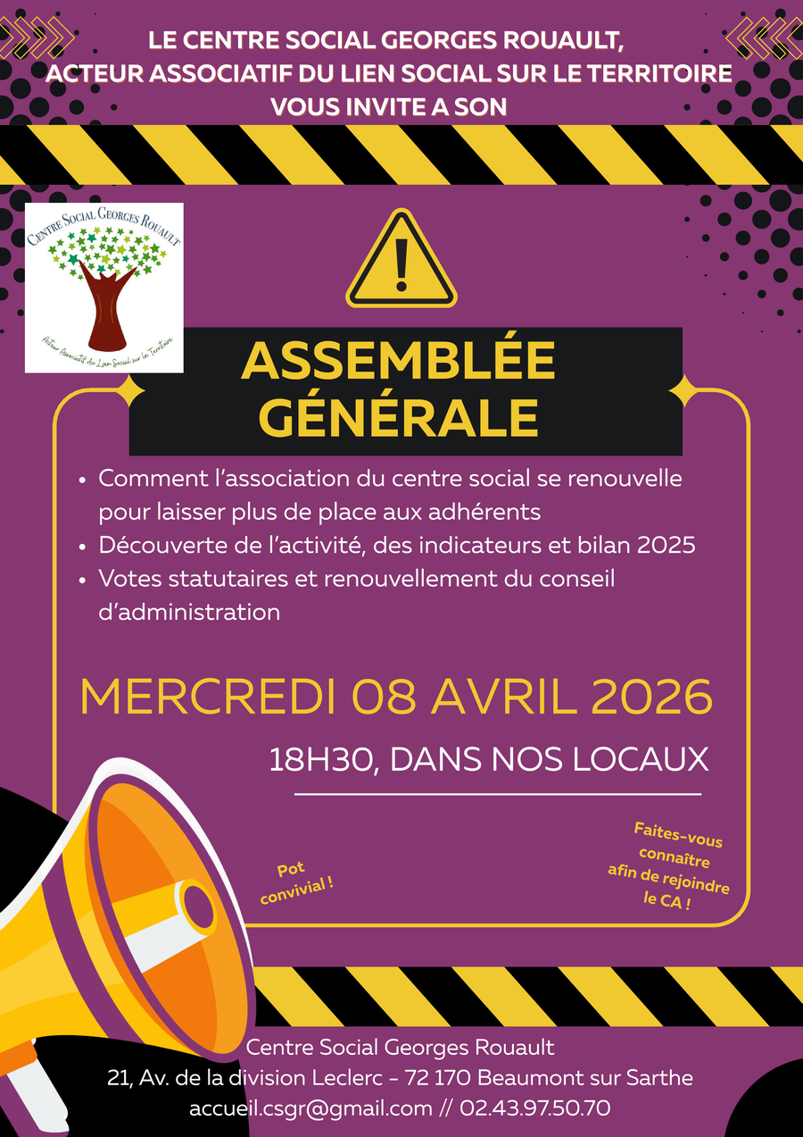 * l'Assemblée Générale : le 8 Avril à 18h30 au centre social
