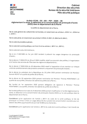 un arrêté préfectoral réglementant la vente, la détention et la consommation de protoxyde d’azote (N2O) dans le département de la Marne.
