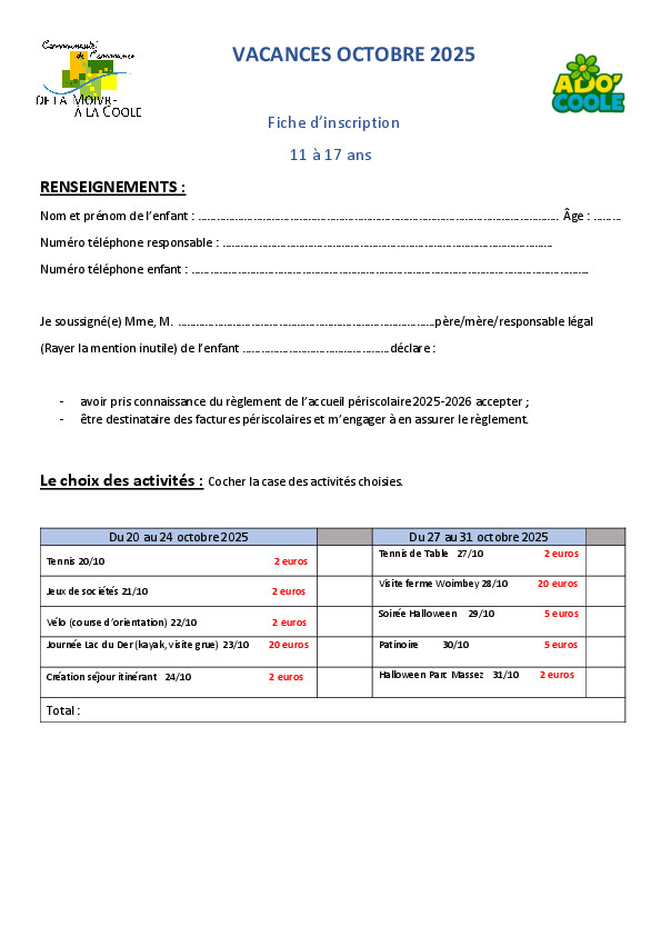 Les documents (ci-dessous) relatifs aux inscriptions sont à retourner à l'adresse mail : animation@ccmc51.fr