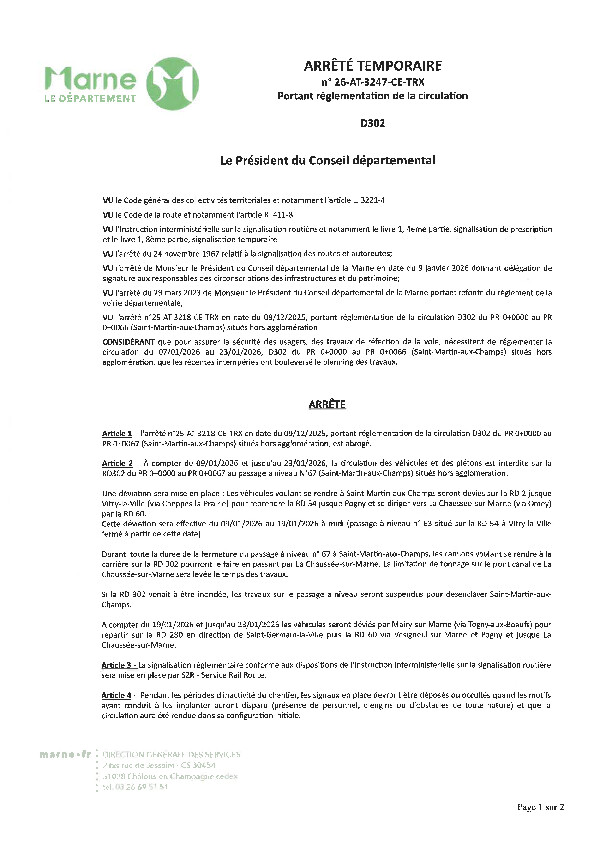 Ci-dessous arrêté de circulation et déviation du Département de la Marne suite aux travaux sur les passages à niveau.