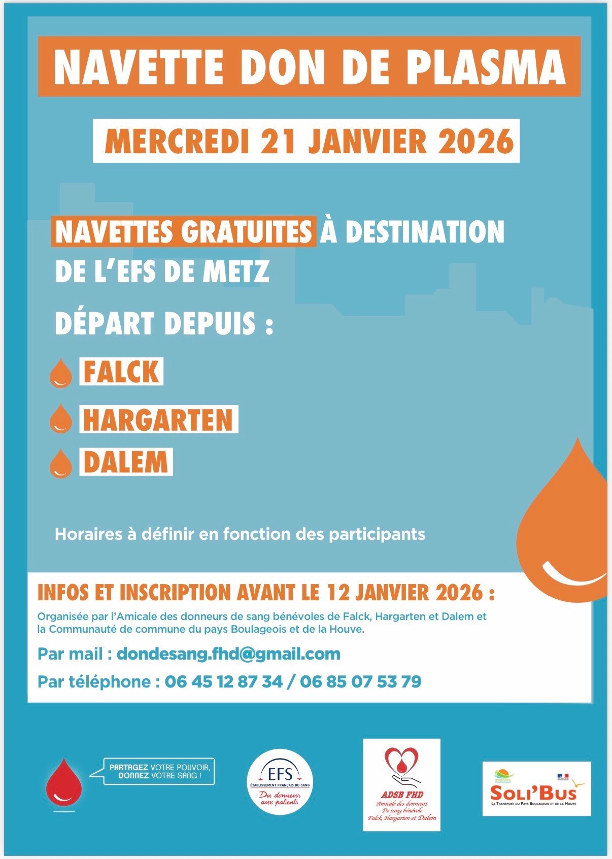 Pour les personnes souhaitant faire un don de leur plasma, une navette gratuite est organisée par l’Amicale des donneurs de sang bénévoles de Falck, Hargarten et Dalem en partenariat avec la Communauté de Communes de la Houve et du Pays Boulageois pour se rendre à la maison du don à Metz :