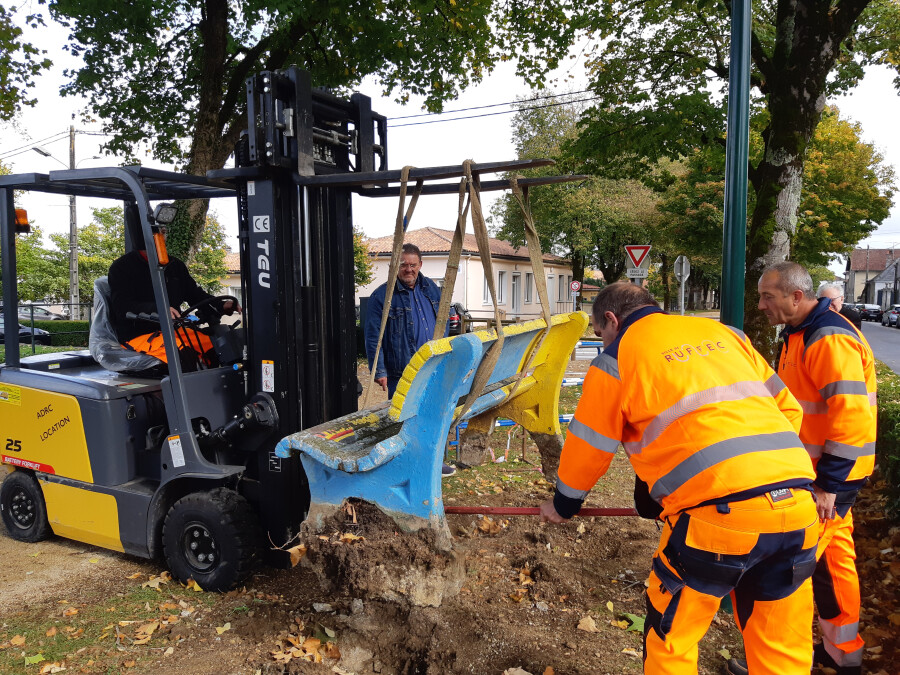 Les services techniques ont déposé les anciens bancs en pierre Place du Champ de Foire et Promenade André Foiselle, jusqu’au groupe scolaire Edmond-Meningaud, afin de les remplacer par du nouveau mobilier urbain.