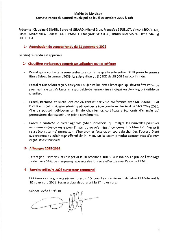 Présents : Pascal MALAQUIN, Michel GIEN, Bruno MALESSIEU, Françoise SEUILLOT, Vincent BOIREAU, Bertrand GIRARD, Chantal GUILLEMARD