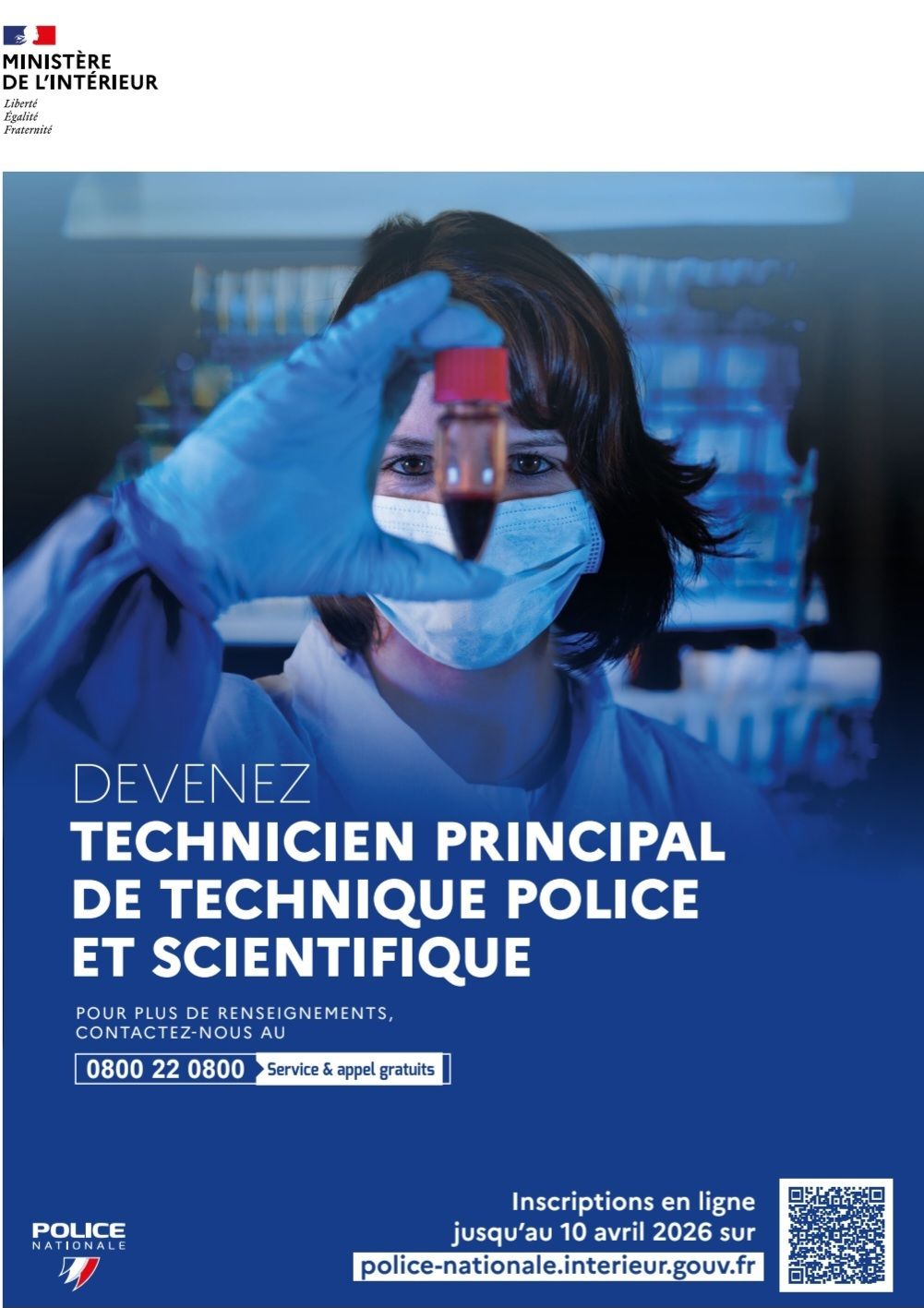 La police nationale recrute des techniciens principaux de policetechnique et scientifique.