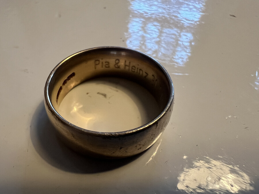 Description brève : alliance en or, taille moyenne. Inscriptions visibles : « Pia et Heinz » et une date + une autre inscription (non divulguées ici ; je les utiliserai pour vérifier l’identité du propriétaire).