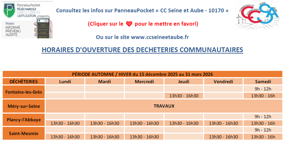 La communauté de communes Seine et Aube est heureuse de mettre à disposition des habitants de son territoire l'application PanneauPocket. Par cet outil très simple, elle souhaite tenir informés en temps réel les citoyens de son actualité au quotidien, et les alerter en cas de risques majeurs. Cette solution gratuite pour les habitants, sans récolte de données personnelles et sans publicité, permet d'établir un véritable lien privilégié entre l'intercommunalité et ses citoyens.