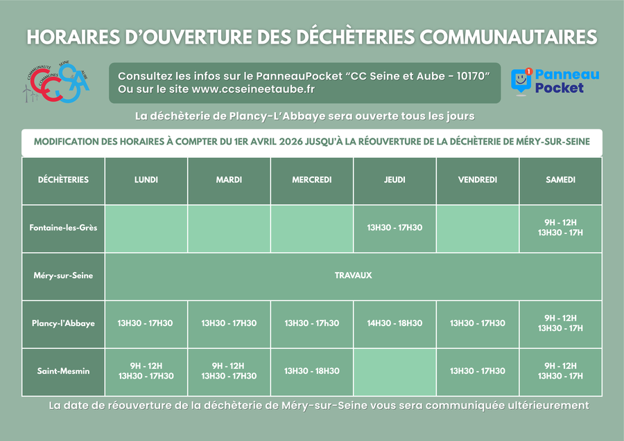 Voici les horaires des déchetteries durant la fermeture de la déchetterie de Méry-sur-Seine pour travaux jusqu'à nouvel ordre.