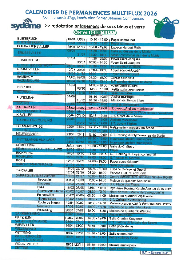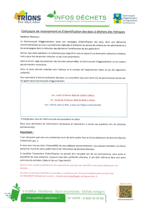 Une permanence pour remise de l'autocollant relatif à l'indentification des bacs à déchets ménagers aura lieu ce jour de 12h45 à 18h15 ainsi que demain vendredi de 8h45 à 14h15 en au RDC de la Mairie