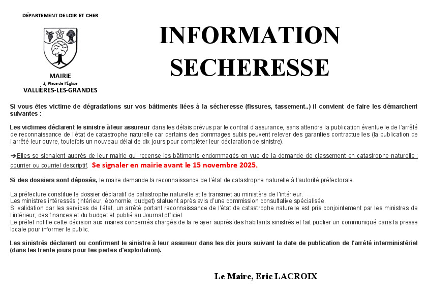 Si vous êtes victime de dégradations sur vos bâtiments liées à la sécheresse (fissures, tassement..) il convient de faire un signalement en mairie et de suivre les démarches indiquées dans le docuement joint