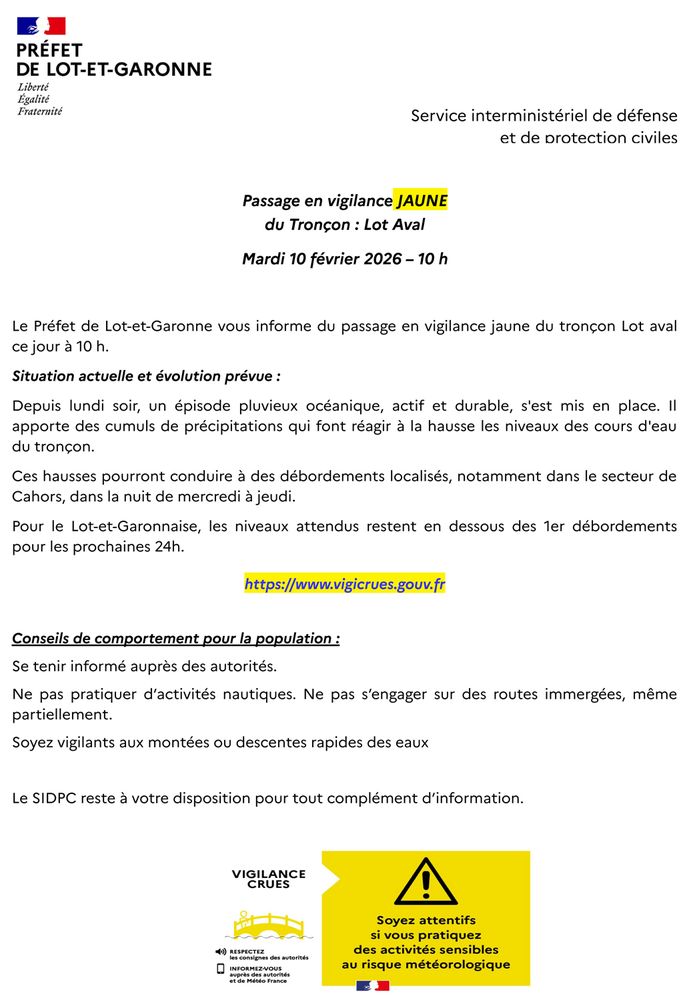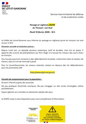 Le Préfet de Lot-et-Garonne vous informe du passage en vigilance jaune du tronçon Lot aval