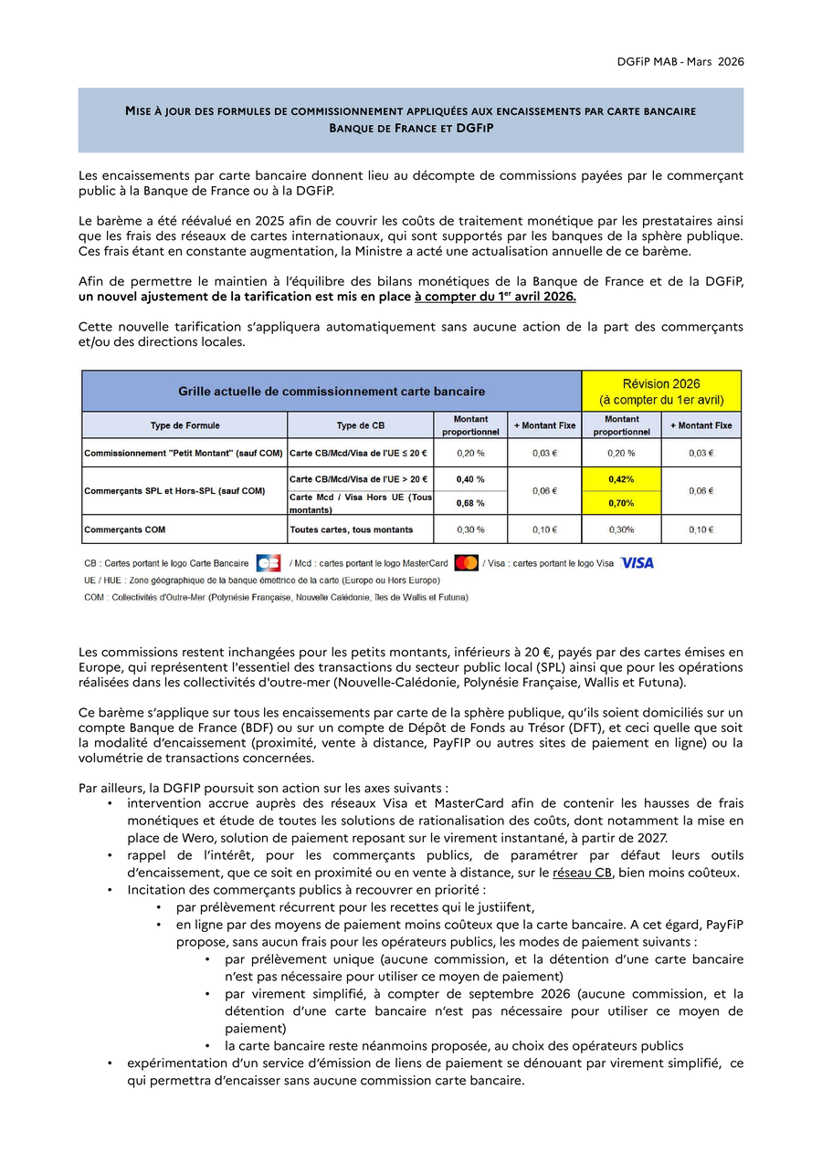 Les tarifs des commissions carte bancaire sont réévalués au 1er avril 2026 conformément à l'engagement de réévaluation annuel validé en 2025.