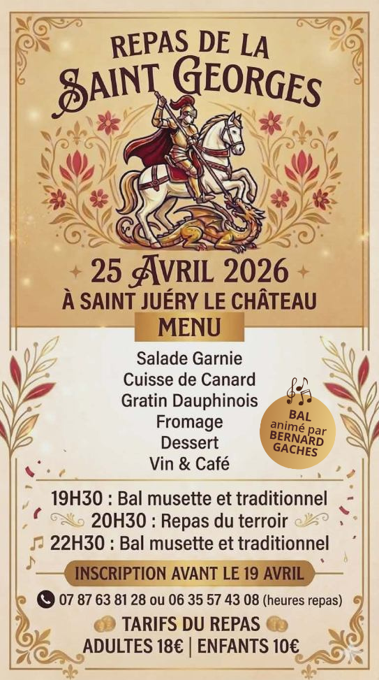 L'AREA a le plaisir de vous convier à la prochaine édition de la "Fête de la Saint-Georges", le samedi 25 avril à la salle des fêtes de Saint Juéry ! 🥳