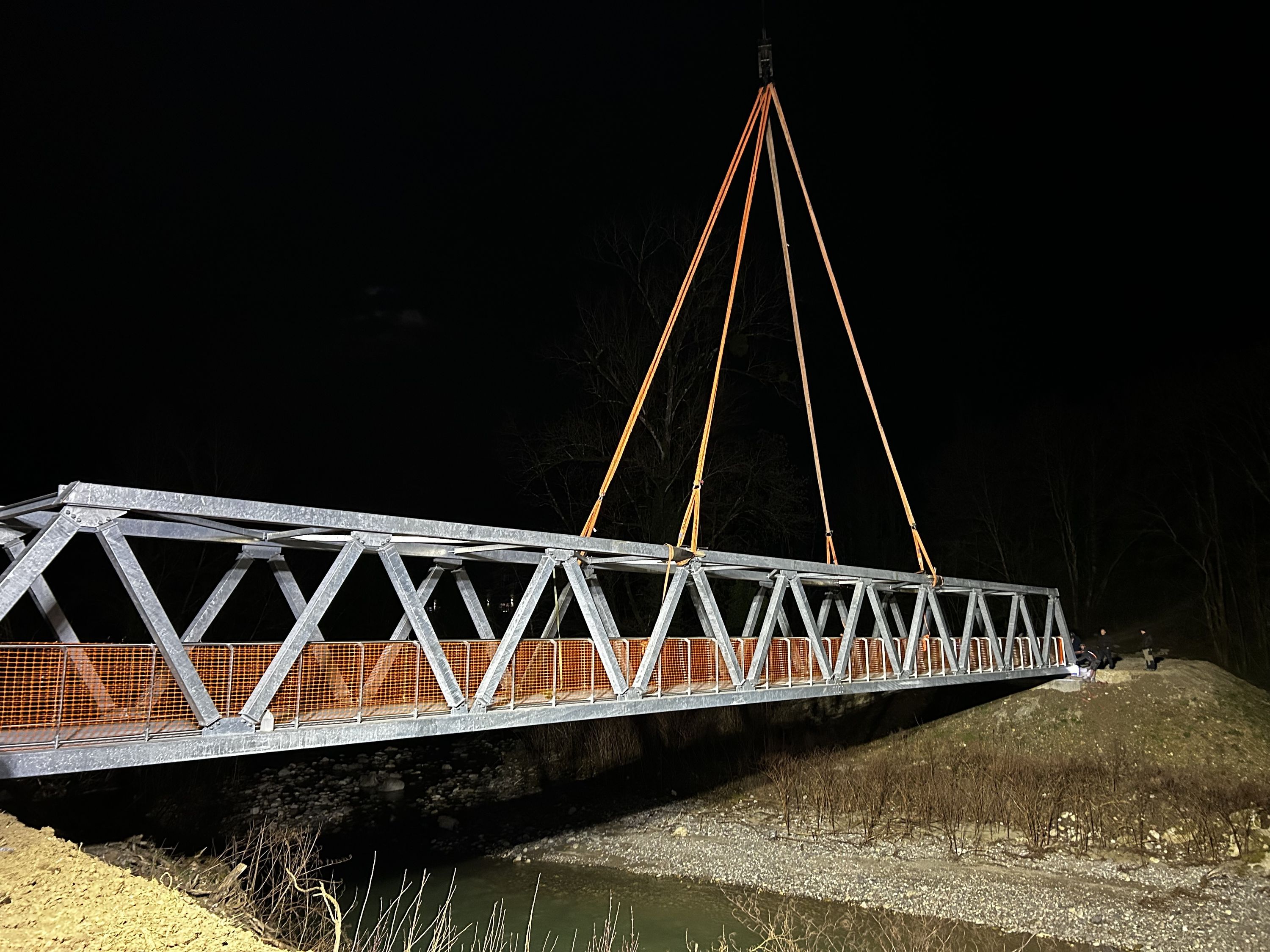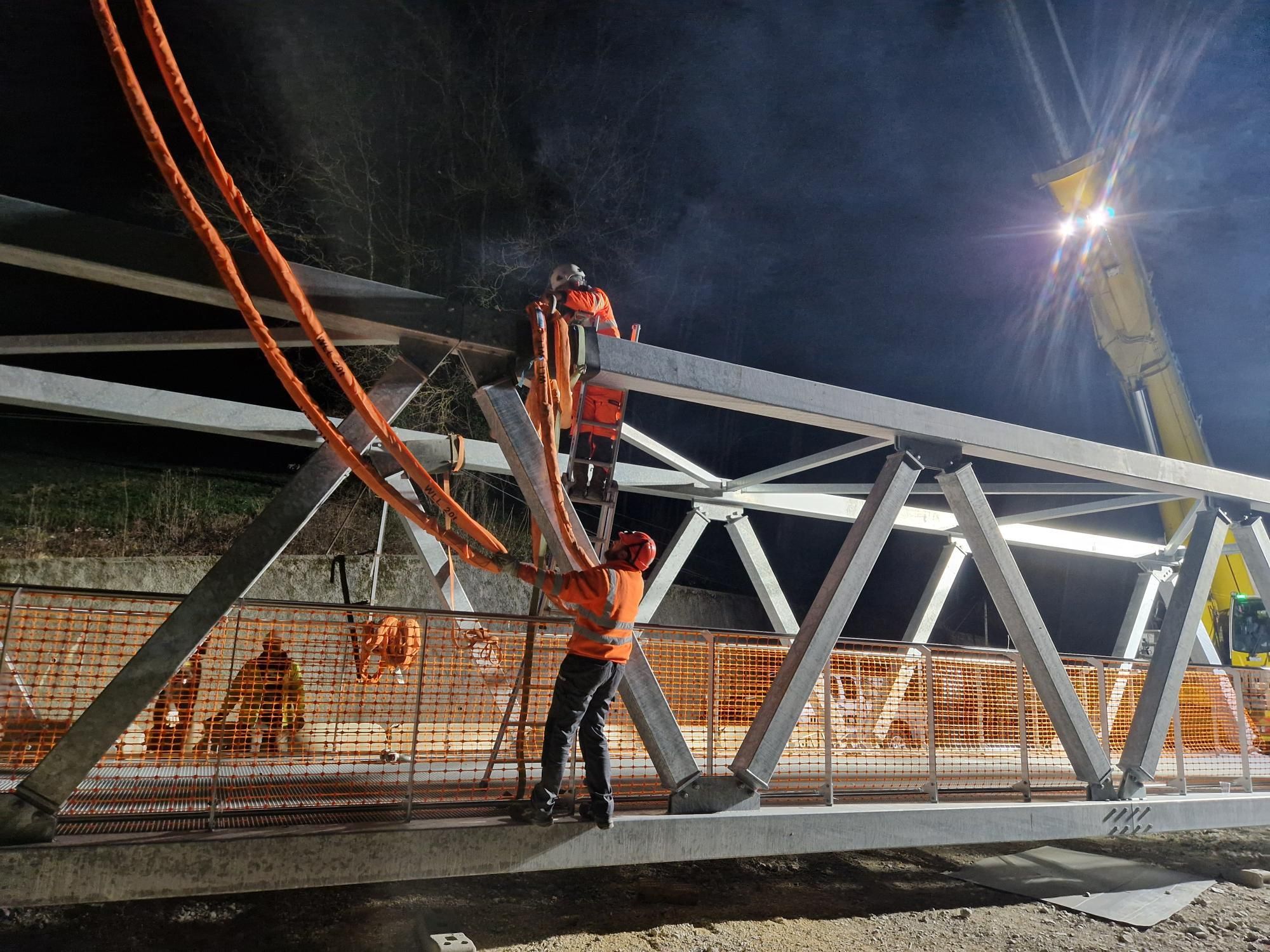 Dans la nuit du jeudi 5 mars, à 22h, un moment fort du chantier de la véloroute V62 « La Belle Via » a eu lieu à Musièges : la pose de la passerelle cyclable qui permettra de franchir les Usses. Grâce à une grue impressionnante et au travail des équipes mobilisées, cette structure de 40 mètres et près de 25 tonnes a été installée avec succès au-dessus de la rivière.