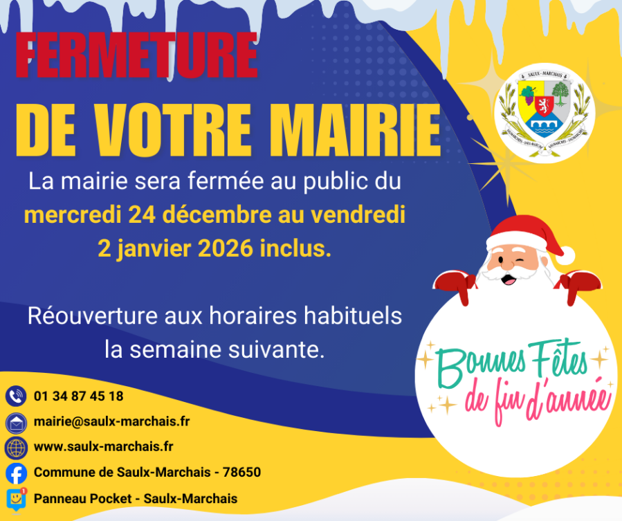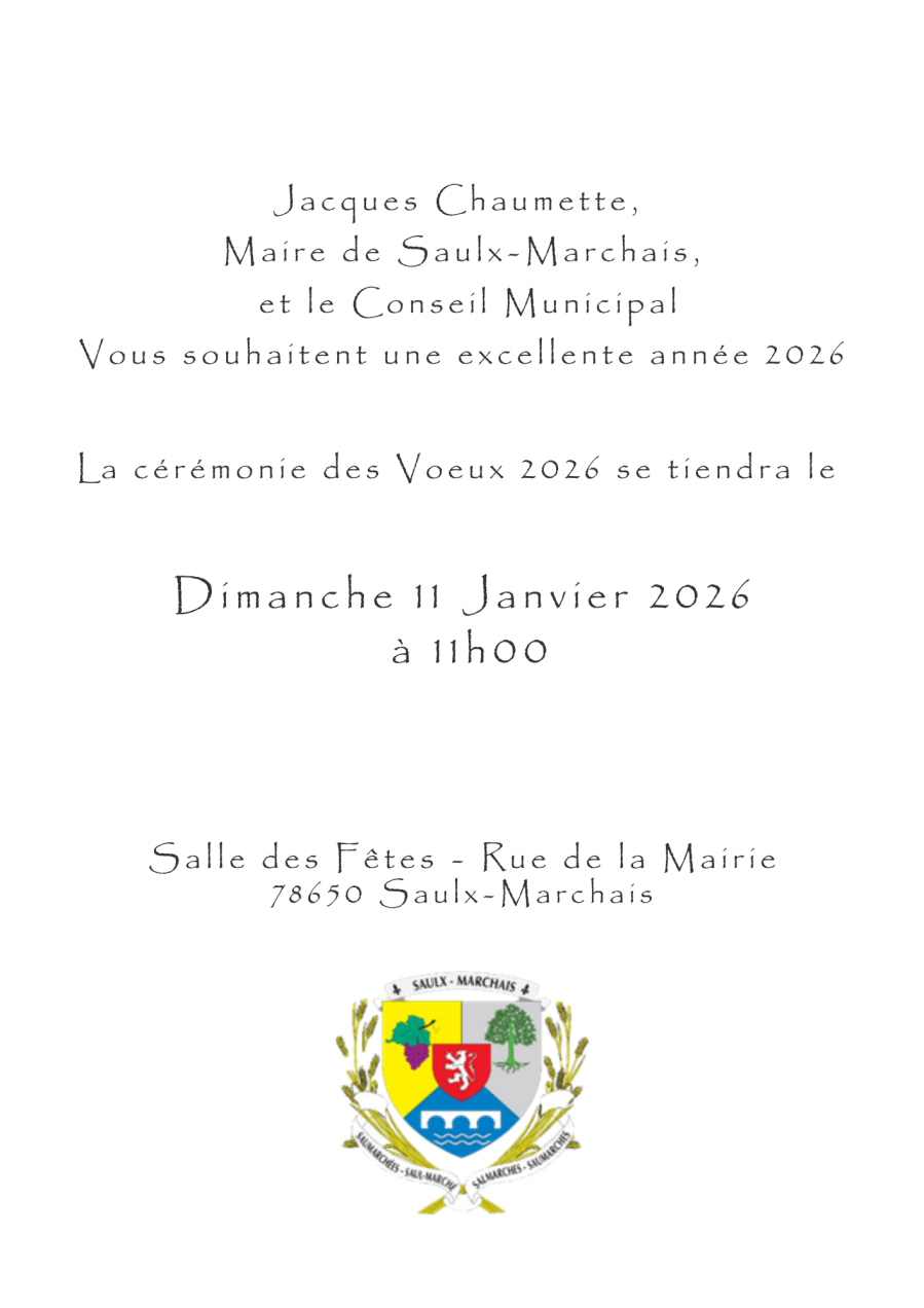 À l’approche des fêtes de fin d’année, Jacques Chaumette, Maire de Saulx-Marchais, et le Conseil municipal ont le plaisir de vous informer que la cérémonie des vœux du Maire se tiendra le Dimanche 11 janvier à 11h00.