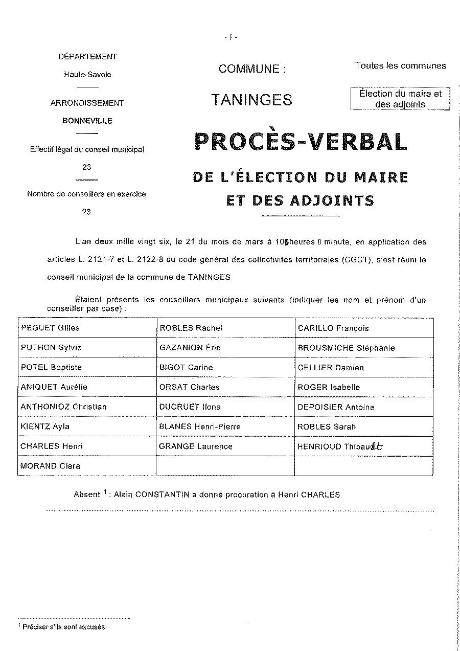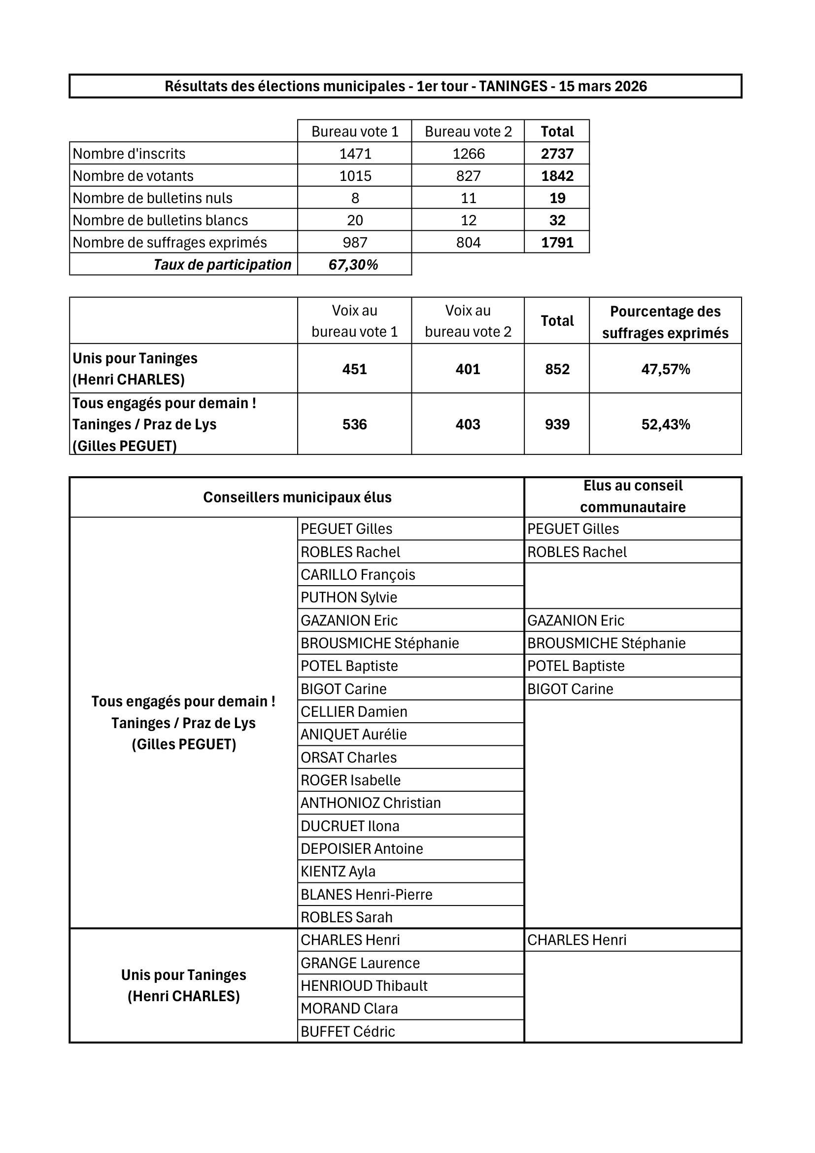 La liste « Unis pour Taninges (Henri CHARLES) » obtient 47.57 % des votes (5 conseillers municipaux élus).