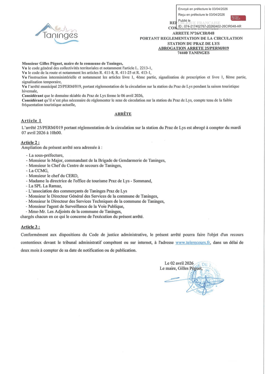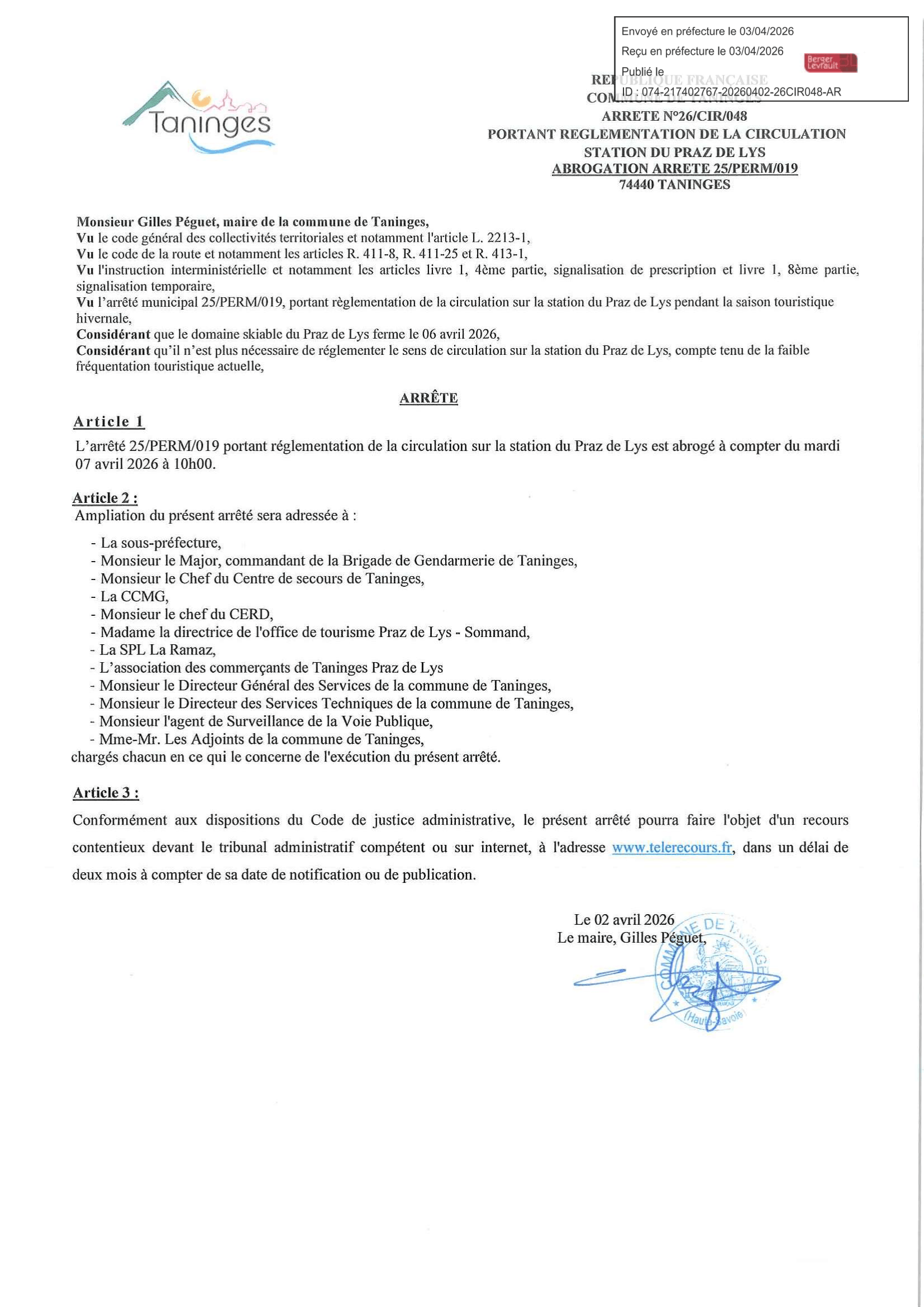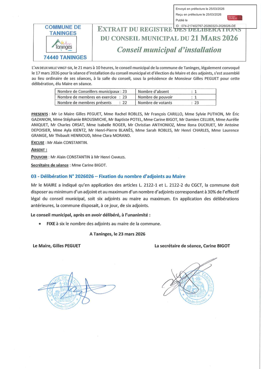 La liste « Tous engagés pour demain ! Taninges / Praz de Lys (Gilles PEGUET) » obtient 52.43 % des votes (18 conseillers municipaux élus).