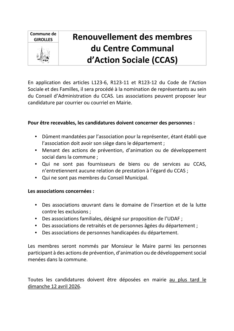 Suite aux élections municipales du 20 mars 2026, la commune de Girolles lance le renouvellement du Conseil d’Administration du Centre Communal d’Action Sociale (CCAS)