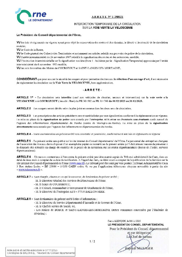La circulation sera interdite (sauf aux véhicules de chantier, secours et intervention) sur la véloscénie à Courgeoût du 1 er au 31 décembre 2025 pour la réfection d'un ouvrage d'art.