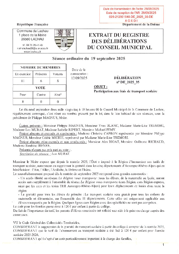 Lors de sa réunion du 19 septembre, le Conseil municipal a voté une aide aux parents d'élèves pour le transport scolaire drômois dont le tarif, qui était encore gratuit pour l'année 2024-2025, a été fixé à 120 € pour les enfants à partir du collège pour 2025-2026.