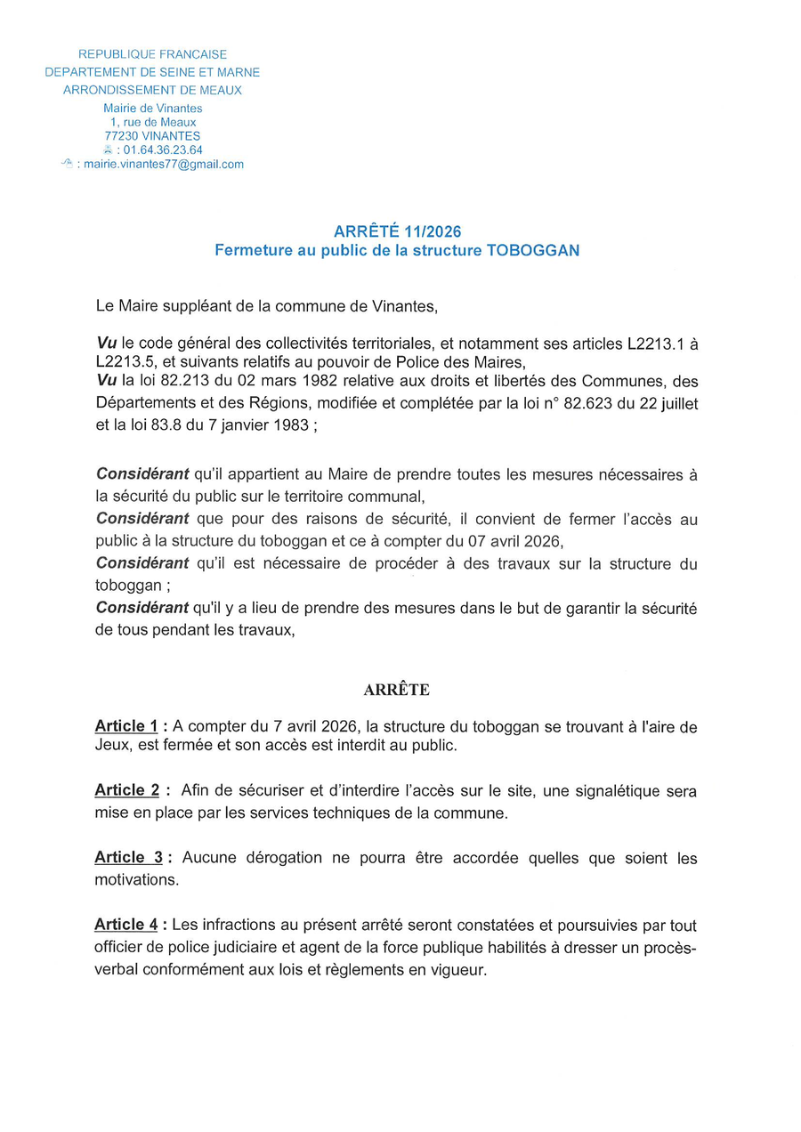Des travaux sur la structure toboggan de l'aire de jeux s'avèrent nécessaires ; A compter du 7 avril 2026, l'accès à cette structure sera interdit au public afin de garantir la sécurité de tous. Merci pour votre compréhension