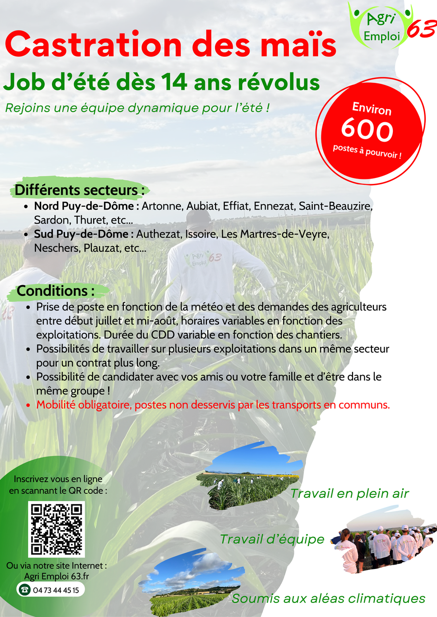 Agri Emploi 63 recherche, pour le compte de ses agriculteurs adhérents, 600 saisonniers pour l’été 2026, principalement pour l’épuration et la castration des maïs. Ces postes sont à pourvoir sur l’ensemble du département du Puy-de-Dôme, avec une concentration en zone de Limagne.
