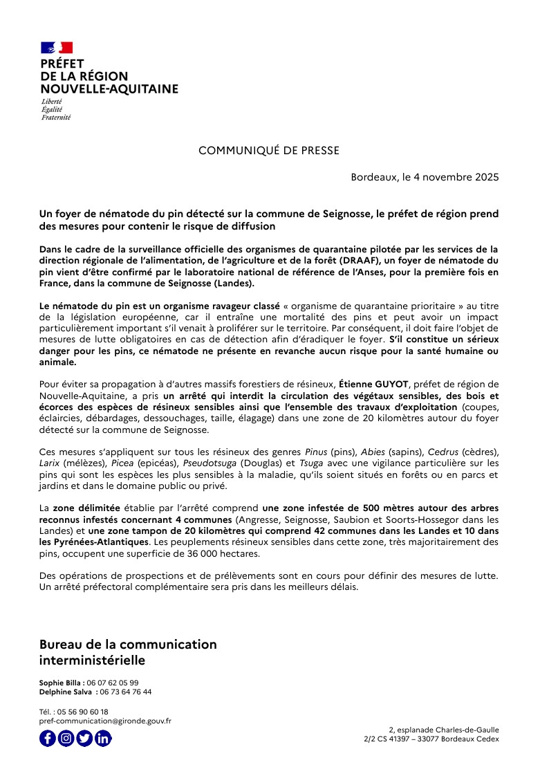 Un foyer a été détecté pour la première fois en France sur la commune de Seignosse. Cet organisme ne présente aucun danger pour l’homme ou les animaux, mais représente une menace majeure pour la forêt des Landes de Gascogne. La coopération de tous couplée à une intervention rapide permet de protéger nos forêts, notre paysage, et nos activités locales liées au bois.