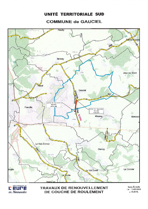 Pour information et prise en compte, des travaux de réfection de la bande de roulement de la RD 57e (Gauciel à RN13) vont être effectués les 4 et 5 novembre selon les conditions météorologiques. Une déviation de la circulation sera mise en place.