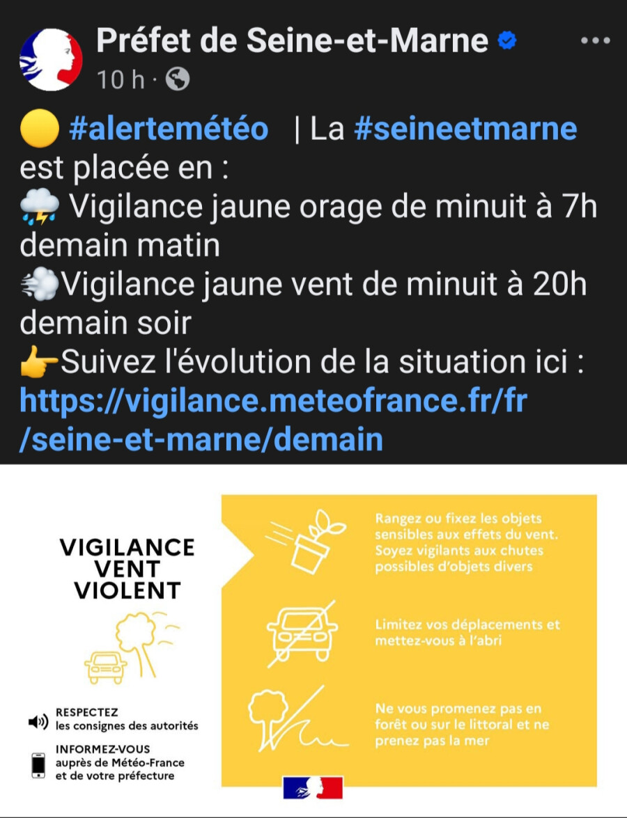 La Seine et Marne est placée dès ce soir minuit en alerte vigilance Jaune 🟡