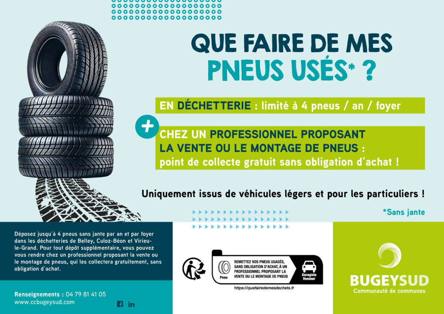 Pour les pneus usés, vous pouvez les déposer gratuitement, sans obligation d'achat, chez vos garages ou concessionnaires locaux (professionnels proposant la vente ou le montage de pneus).