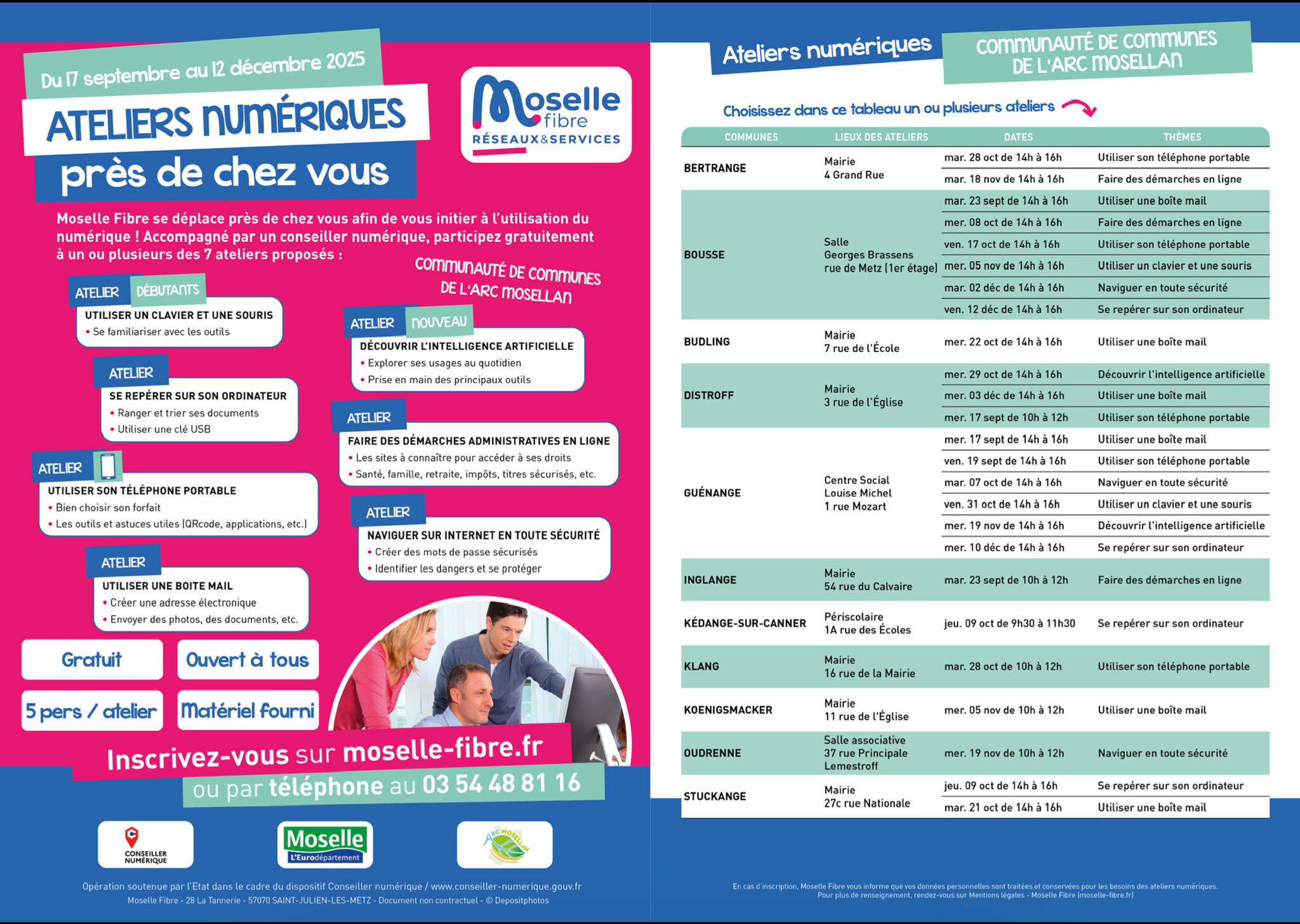 Dans le cadre de sa mission d’accompagnement de la population aux outils numériques, MOSELLE FIBRE a d’ores et déjà pu organiser, depuis 2022, près de 2500 ateliers numériques, offrant ainsi aux Mosellans la possibilité d’être accompagnés, au plus près de chez eux, par nos Conseillers numériques sur les démarches administratives en ligne ainsi que d’autres thèmes.