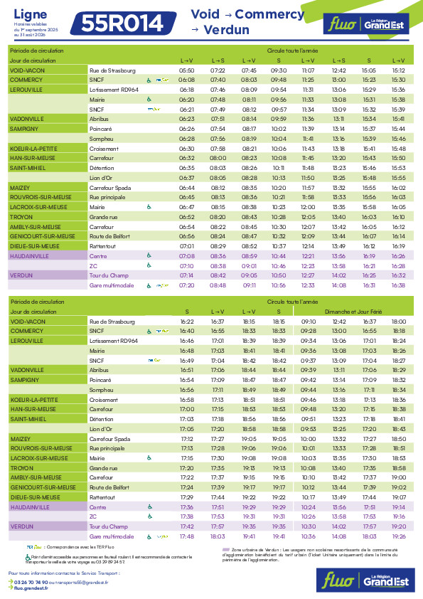 Des correspondances (avec toutefois un temps d’attente) sont également possibles à SAINT-MIHIEL avec la ligne régulière 55R-14 qui assure la liaison VOID/COMMERCY/SAINT-MIHIEL/VERDUN et retour.