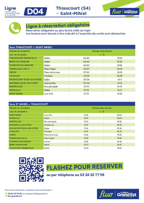 Ce service fonctionne sur réservation préalable en contactant le numéro mentionné sur la fiche horaire.