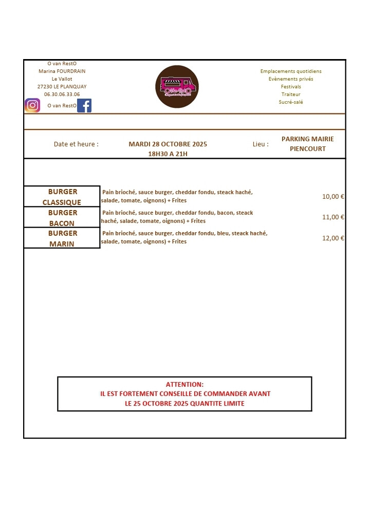 Marina et son Food-truck vous propose une soirée burgers , mardi 28 octobre à partir de 18h30 ,pendant les vacances scolaires ! pensez à réserver 🙏