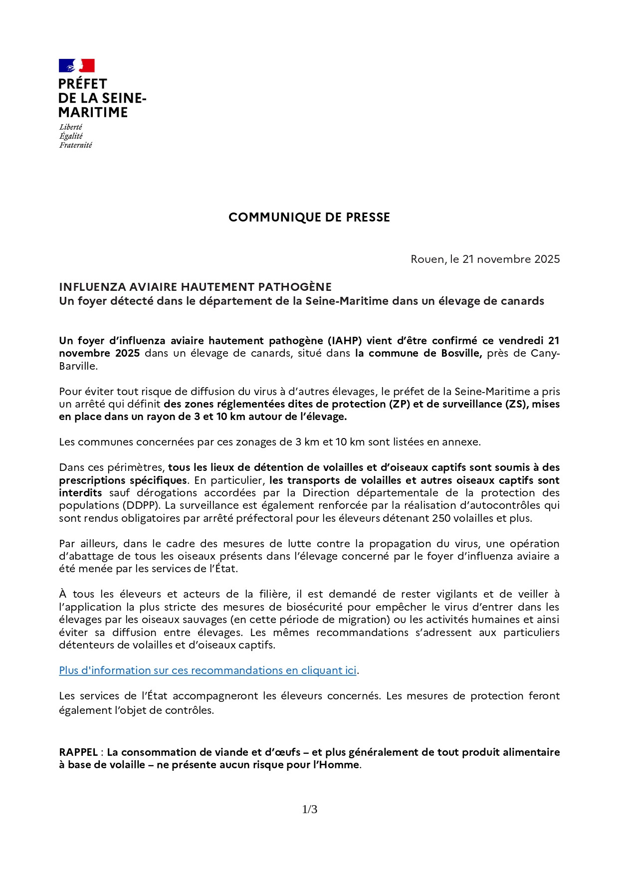 Le Préfet de la Seine-Maritime vous informe qu’un foyer d’influenza aviaire hautement pathogène a été détecté dans le département de la Seine-Maritime, sur la commune de Bosville.