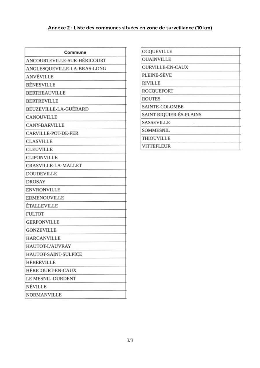 Pour éviter tout risque de diffusion du virus à d’autres élevages, le Préfet de la Seine-Maritime a pris un arrêté qui définit des zones réglementées dites de protection et de surveillance mises en place dans un rayon de 3 et 10 km autour de l’élevage.